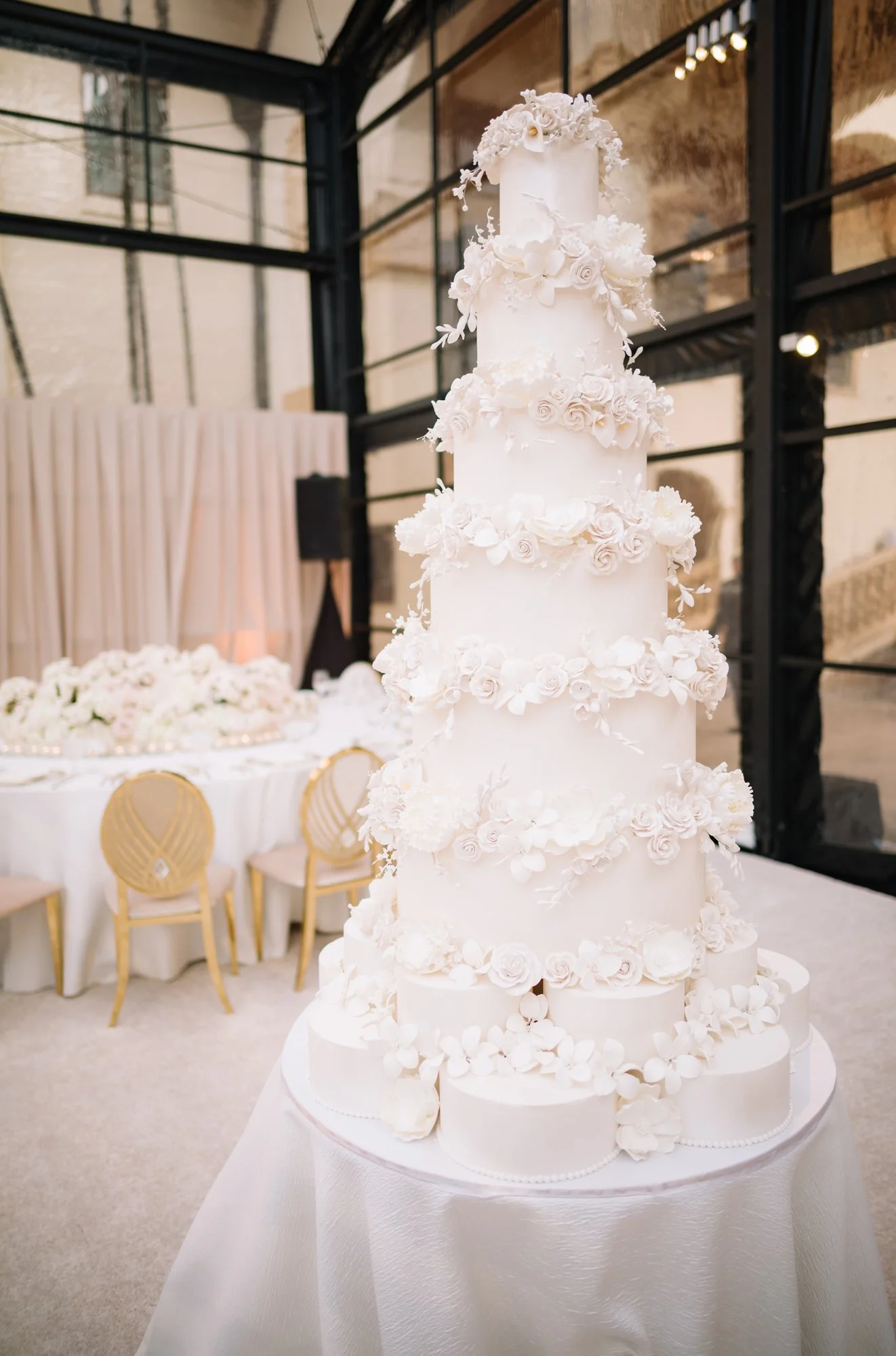 The transformation of the reception space was the work of Birch Event Design, who brought their signature attention to detail to Miami. Under a ceiling of suspended white florals and crystal strands, the ballroom was reimagined with round tables dressed in neutral linens, gold-backed chairs, and romantic candlelight. The effect was immersive, grand, and unmistakably Birch, luxury design at its highest level.